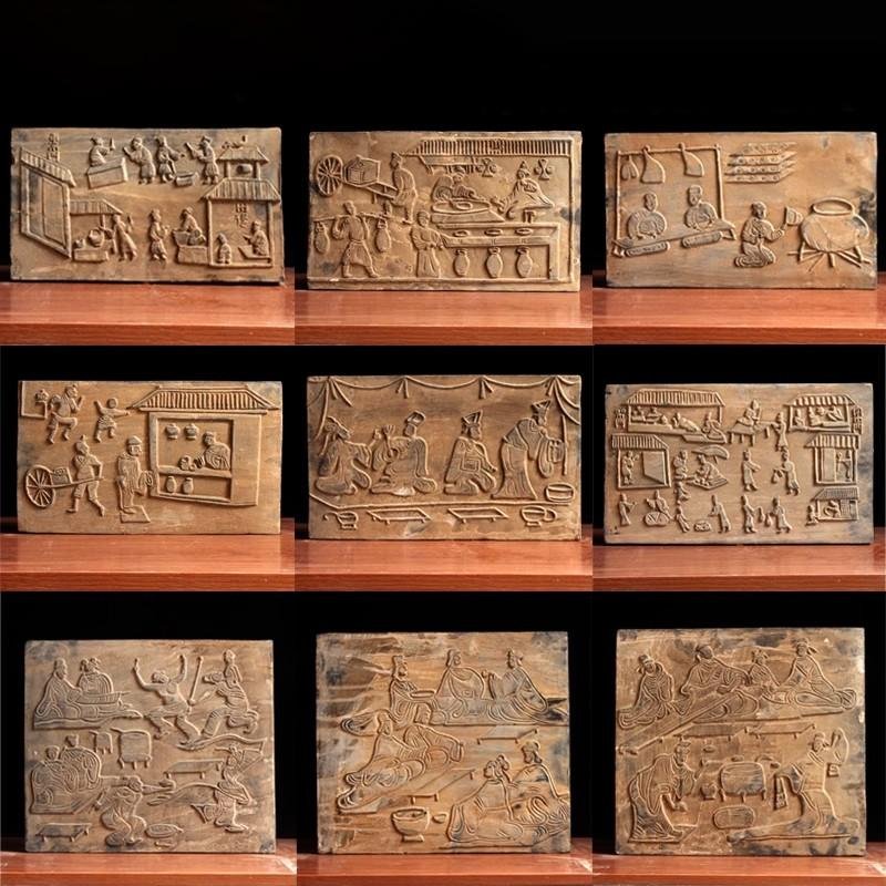 | Pattern | Brick with Salt-making Portrait, Brick with Well Salt Portrait, Dongshi Gate Portrait Brick No. 1, Dongshi Gate Portrait Brick No. 2, Dongshi Gate Portrait Brick No. 3, Dongshi Gate Portrait Brick No. 4, Market Portrait Brick No. 1, Market Portrait Brick No. 2, Kitchen Portrait Brick No. 1, Kitchen Portrait Brick No. 2, Brewing Portrait Brick No. 1, Brewing Portrait Brick No. 2, Banquet and Drinking Portrait Brick, Banquet and Music Portrait Brick, Feasting and Drinking Portrait Brick, Portrait Brick of Pellet-sword and Banquet Dance, Wine Shop Portrait Brick, Bazaar Portrait Brick, Selling Portrait Brick, Battle Map 30x23cm, Hunting Map No. 1 30x23cm, Hunting Map No. 2 30x23cm, Farming Map 30x23cm, Horse-drawn Cart 30x23cm, Bazaar Map 30x23cm, Harvest Map 30x23cm, Fishing Map 30x23cm, Expedition Map 30x23cm, Demon-slaying 30x23cm, Axe Chariot Map 36x24cm, Small Carriage No. 1 15x10cm, Small Carriage No. 2 15x10cm, Small Carriage No. 3 15x10cm, Small Carriage No. 4 15x10cm, A Set of Small Carriage Bricks, Western Queen Mother 29x24cm, Pellet-sword 29x24cm, Brick with Portrait of Western Queen Mother, Battle Map |